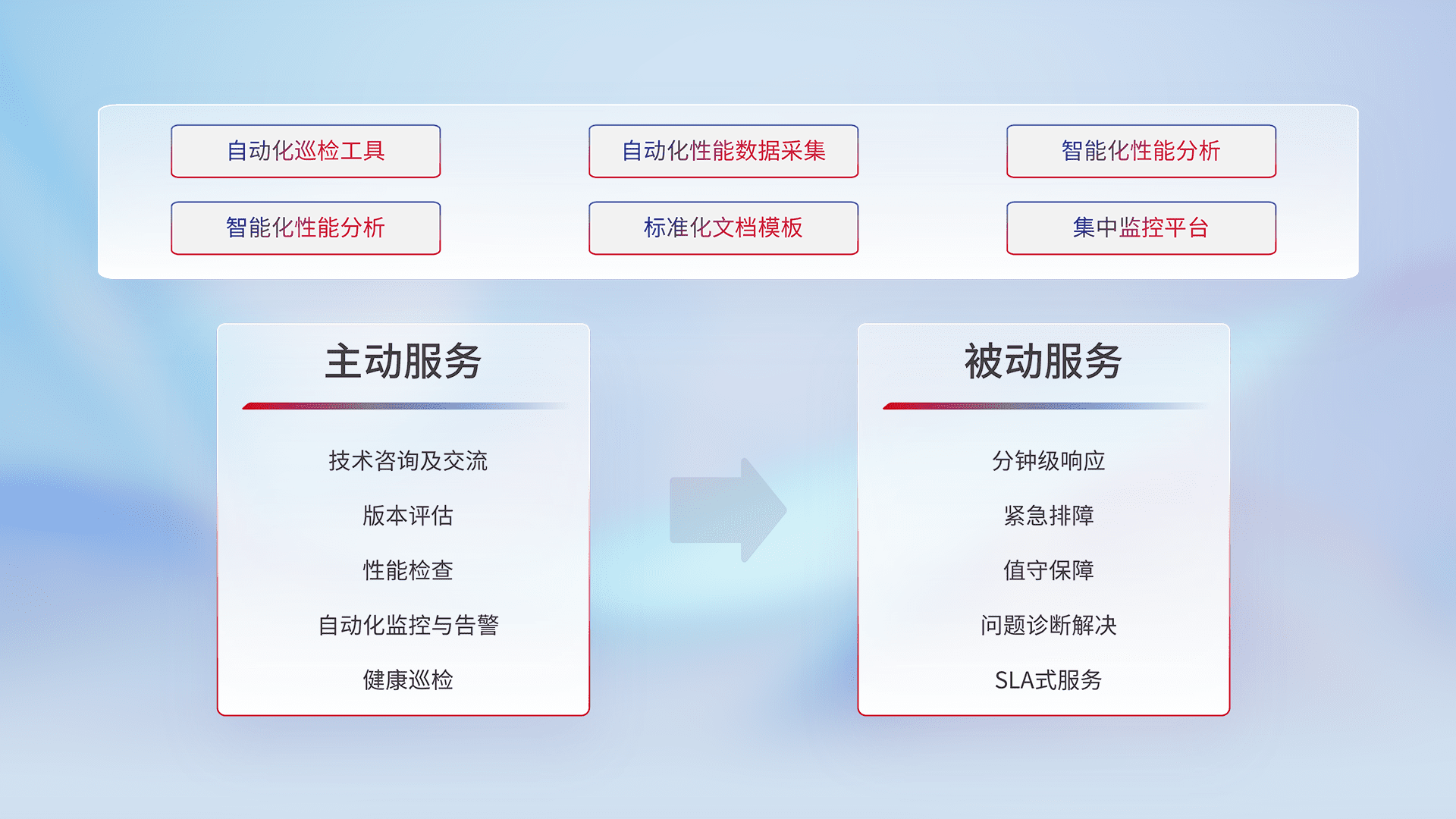 智能化工具和标准化文档,,,,保障服务质量,,,提供主动服务(包含技术咨询、、、、版本评估、、性能检查、、、自动化监控与告警、、、健康巡检)和被动服务包含(分钟级响应、、、、紧急排障、、、、值守保障、、问题诊断解决、、、SLA服务)。。。。